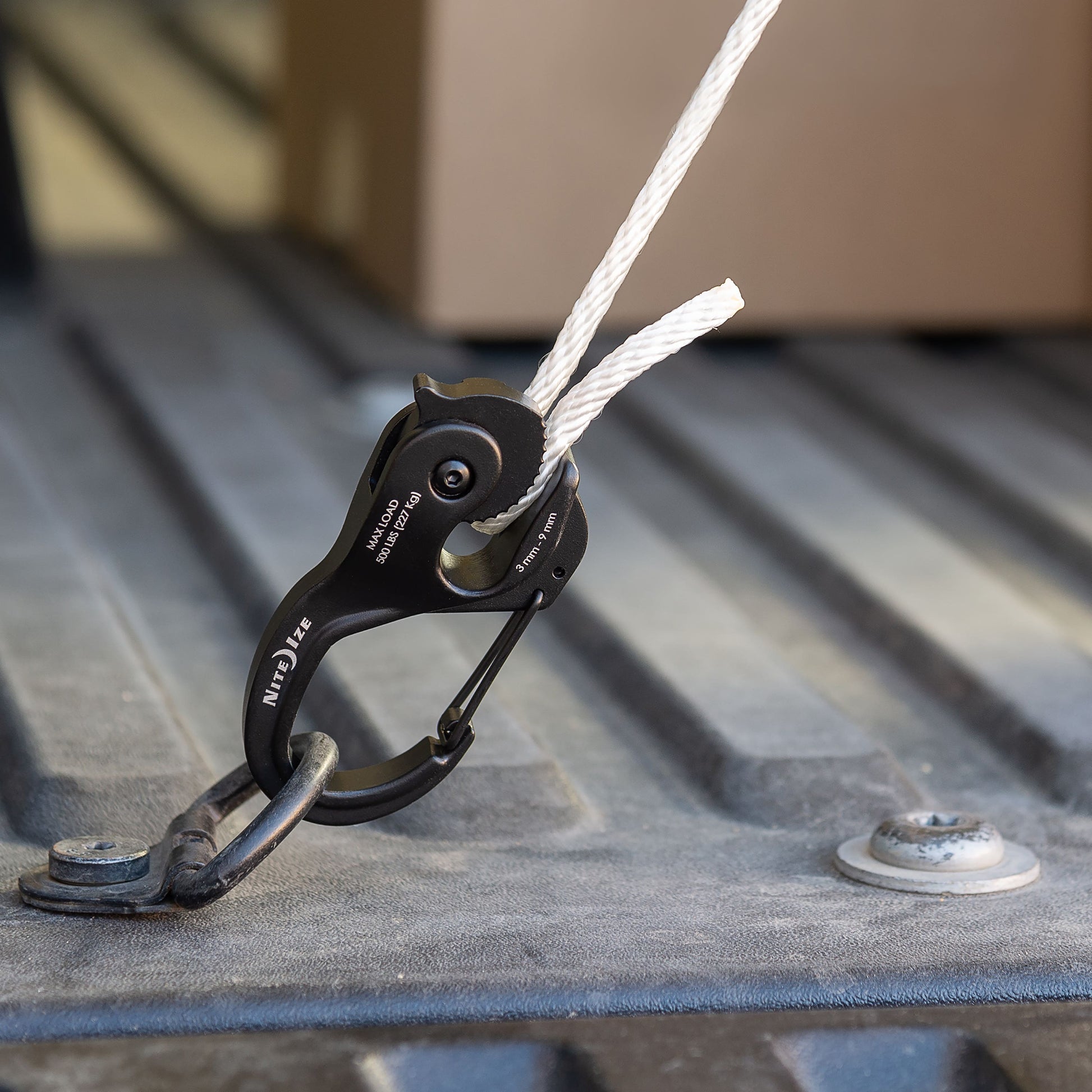 This rugged cast aluminum rope tightener combines a strong carabiner with a cam locking mechanism, allowing you to secure, tension, and connect serious loads using a rope. Clip the carabiner to a fixed anchor point, then slide your rope through the cam mechanism for a knot-free and worry-free connection, easily releasing your rope with a simple pull.