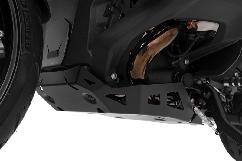 Its tight, contour-hugging shape provides full protection for the engine casing, oil pan, and headers, with minimal impact on ground or cornering clearance. The geometry helps avoid bottoming out – for example, when crossing curbs with a fully loaded bike. Integrated openings allow water to drain easily.