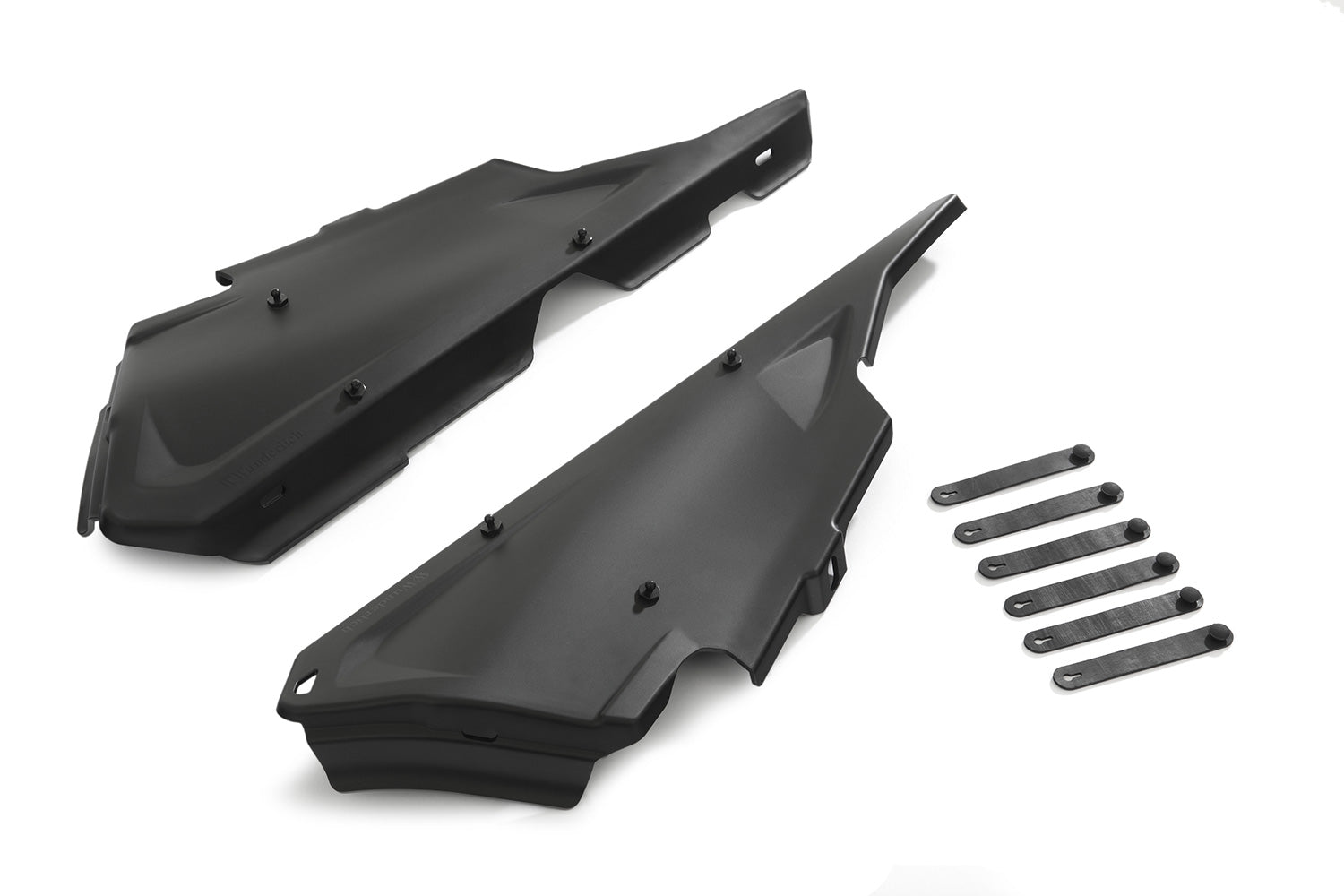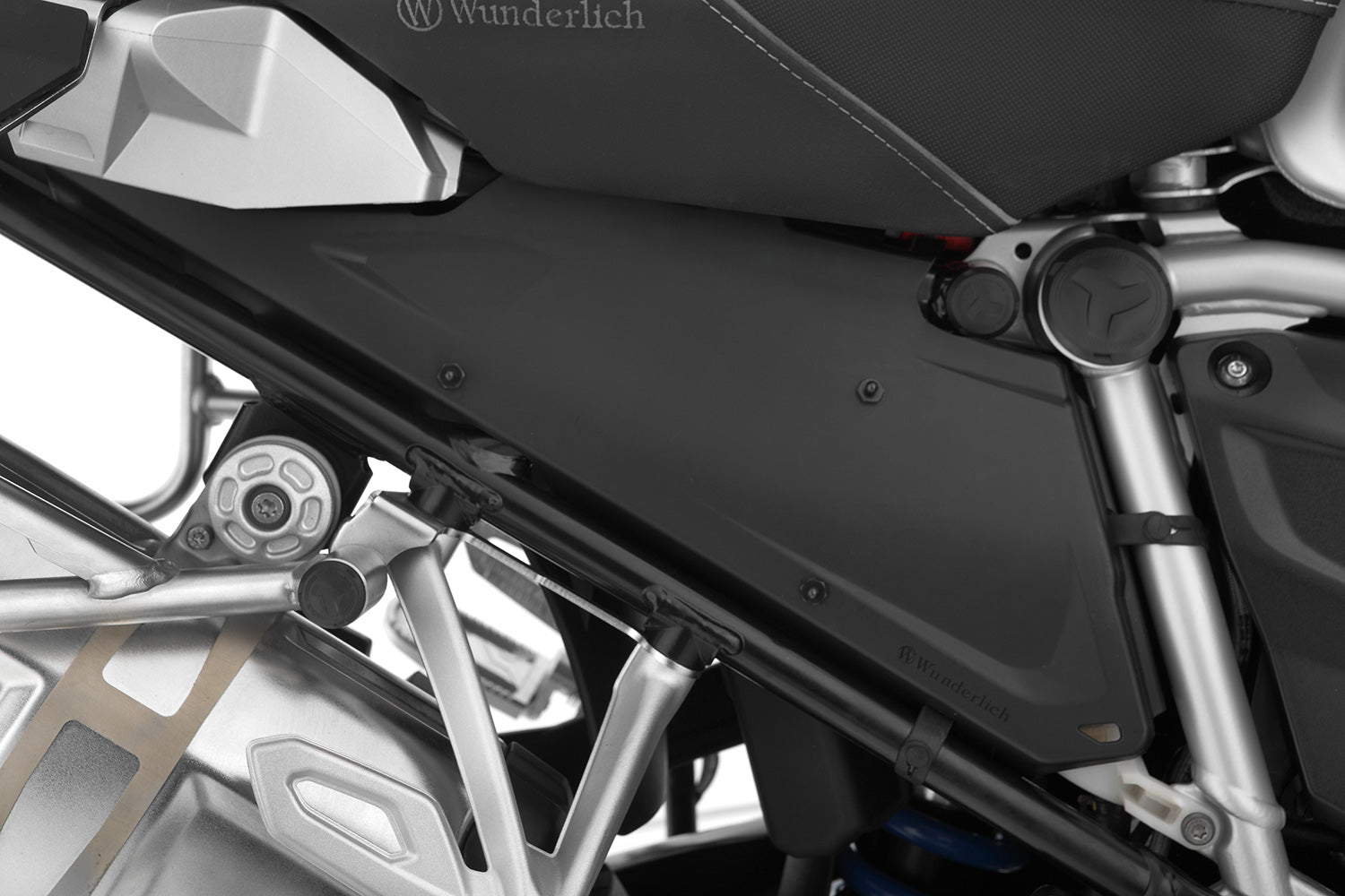 The two frame cover perfectly enclose the two side openings on the rear of the frame. Effectively captures or deflects dirt, stone chips, splashback or spray kicked up before they reach the rider and passenger. Noticeably reduces dirt on the machine. The dynamic design achieved by the moulding remains discreet and looks inconspicuous and appealing on the motorcycle. Assembly and disassembly are equally simple.