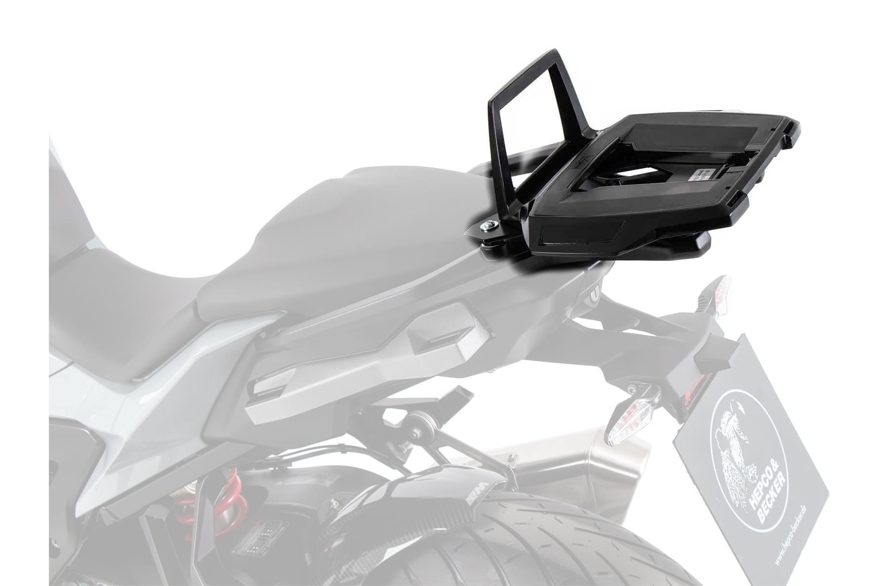 It is made specifically to fit the bike and the Hepco Becker top cases that slide in and lock directly, without any modifications required