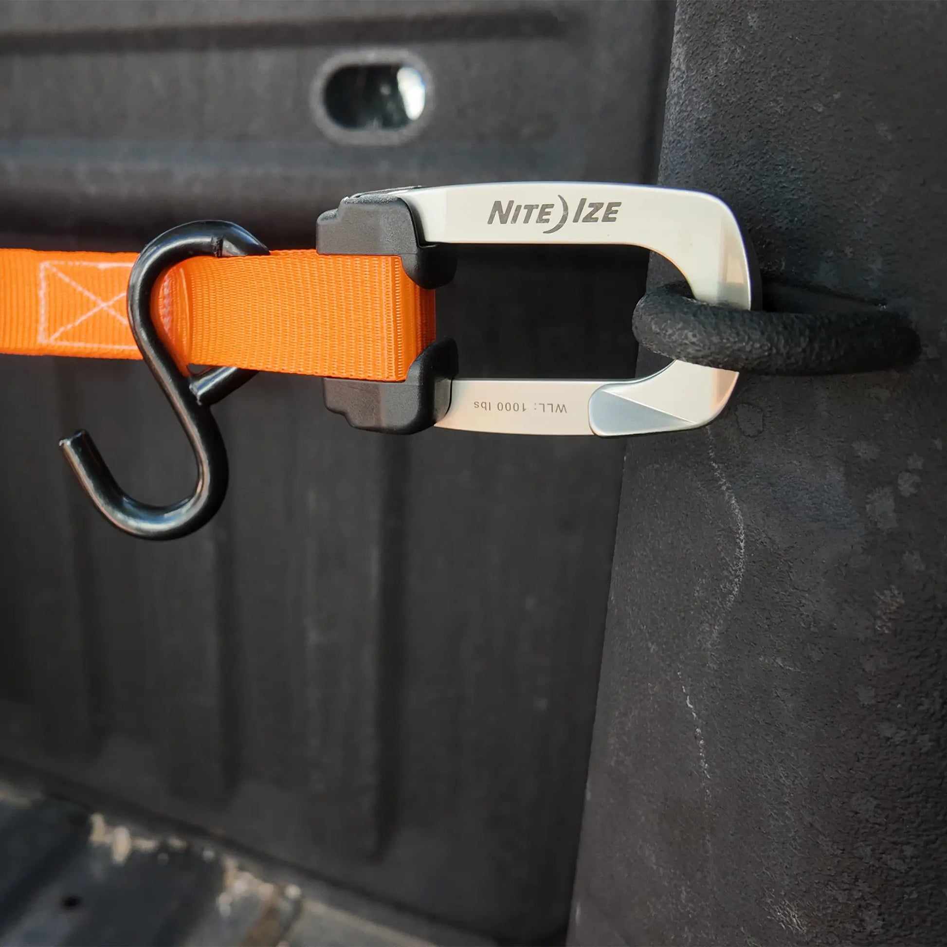 Hook into a superior hook alternative with the CamJam HookLock Strap Hook. This modern design features two interlocking spring-actuated hooks made of corrosion-resistant tempered steel for long-lasting performance. The hook features an easy push-on, twist-off design, staying attached without tension for easy, fuss-free tie down setup. Similar to a pulley, the innovative HookLock design allows a strap to pass smoothly through the guide channel at its base. The hook threads onto most 1” tie down straps and secures to bars, D-rings, and anchor points up to 1” in diameter. When paired with the Nite Ize CamJam Ratchet Strap System, CamJam Tie Down Strap, or Dual CamJam Tie Down System, you can achieve ultimate versatility and security.