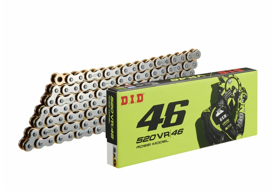 D.I.D's collaboration chain with the one and only Valentino Rossi is now available! With silver outer plates, gold inner plates, and a Rossi yellow colored master link, this chain is certain to POP! With our patented X-Ring seals, this chain will give you the performance and chain life chosen by Rossi himself. (Rivet link available only)