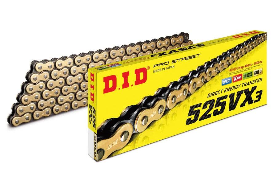 The VX Series chain is a great chain upgrade from OEM and is our most popular and widely used chain on both on and off-road bikes. The 525VX3 boasts a 41% longer chain life than the VO Series due to our patented X-Ring seal technology. It also has increased rigidity as to reduce flex, which gives you a more responsive and smooth driving experience.