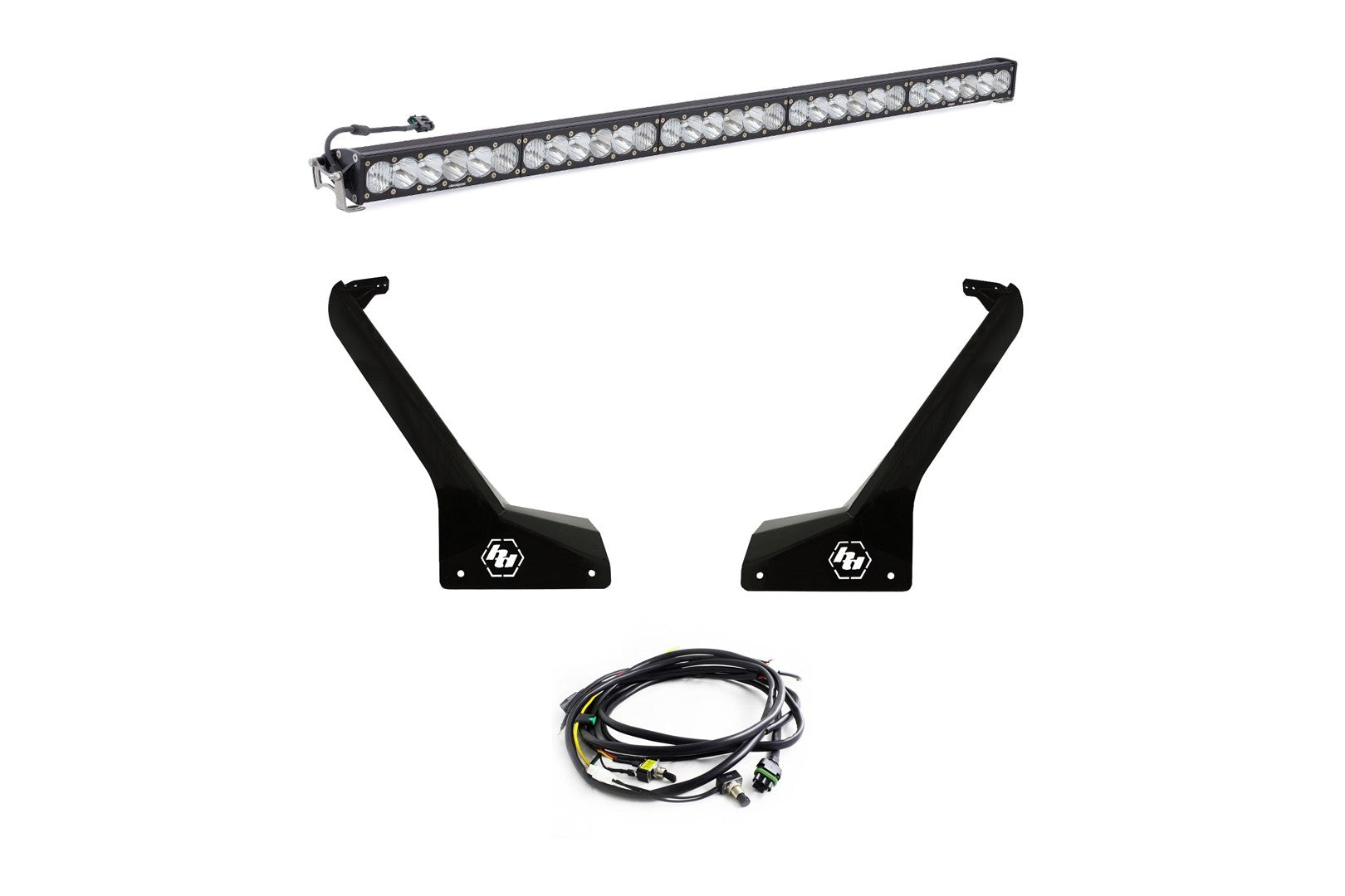 This is the ultimate roof-mounted light bar kit for the Jeep JL and Gladiator JT platforms. The 50-inch OnX6 plus combines far-reaching, high-speed spot reflectors with the Baja Designs Driving Combo lens for a smooth yet intense pattern that lights up the whole trail. This kit includes a 50-inch OnX6 plus LED Light Bar, vehicle-specific mounting brackets, hardware, and wiring to make installation a breeze. No cutting, trimming, or drilling is required and all wiring is pre-sized for your vehicle. This kit includes an Upfitter Wiring harness for models with factory Upfitter switch provisions. For Mojave models, longer bolts will be needed for mounting (See note below). Warning: Installation of any roof-mounted lights will cause a degree of added wind noise depending on vehicle type and installed accessories. NOTE: This roof bar does NOT fit Mojave and 392 models.