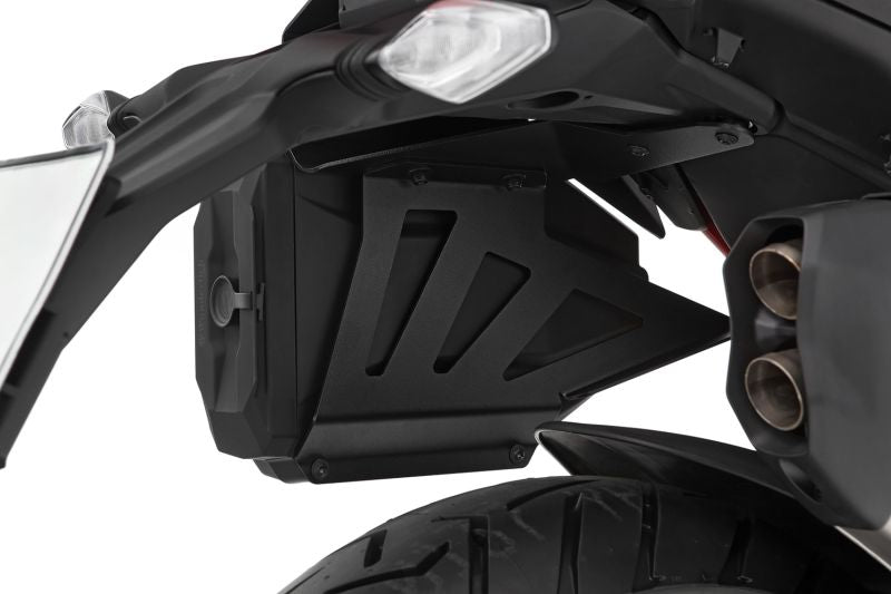 Our tailored tool box offers additional storage space for all kinds of helpful bits and pieces and is suitable for models that don’t come with a case carrier. The functional, robust box is equipped with four solid threaded inserts and attaches securely to the left side of the vehicle via two brackets. The cover is secured against loss. The box made of high-quality plastic is waterproof and extremely robust. We deliver this together with the matching bracket set.
