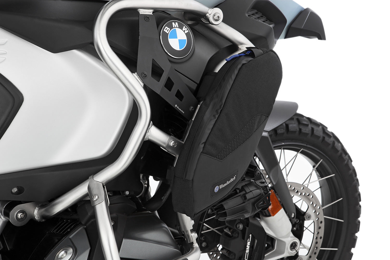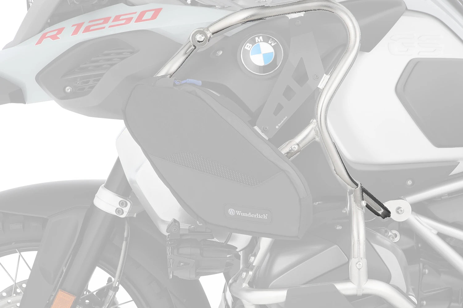 Our water-repellent protection bar bags are ideal for everything you'd like to have ready to hand while on the move: papers, smartphone, sun glasses, keys, multitool, etc. We've designed them so that they fit on the original tank protection bars for the R 1250 GS Adventure. They attach to the protection bar easily and are unshakeable.