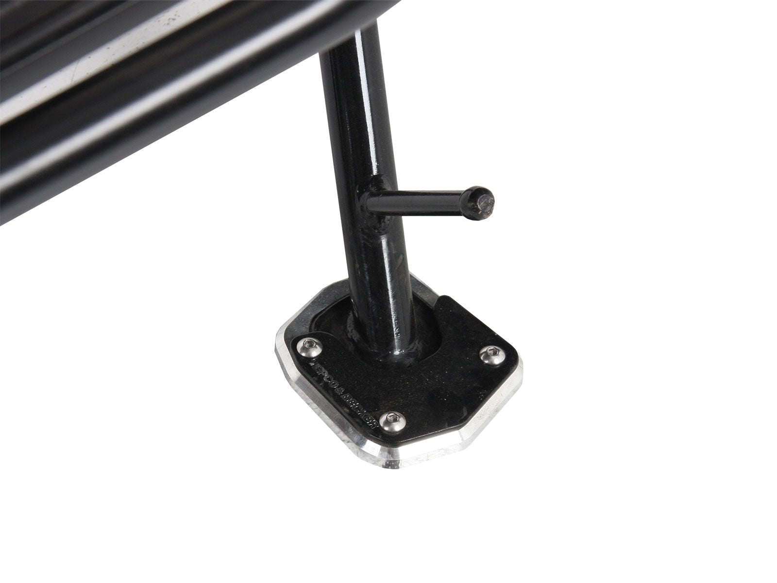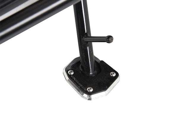 When fully packed or on an unpaved surface, a motorcycle‘s side kickstand can easily sink. A precisely ground extension plate quickly screws onto the side kickstand to prevent this hazard. Contact surface more than 100% larger. External teeth for good grip when unfolding. Easy attachment.- Modern design by using finest materials