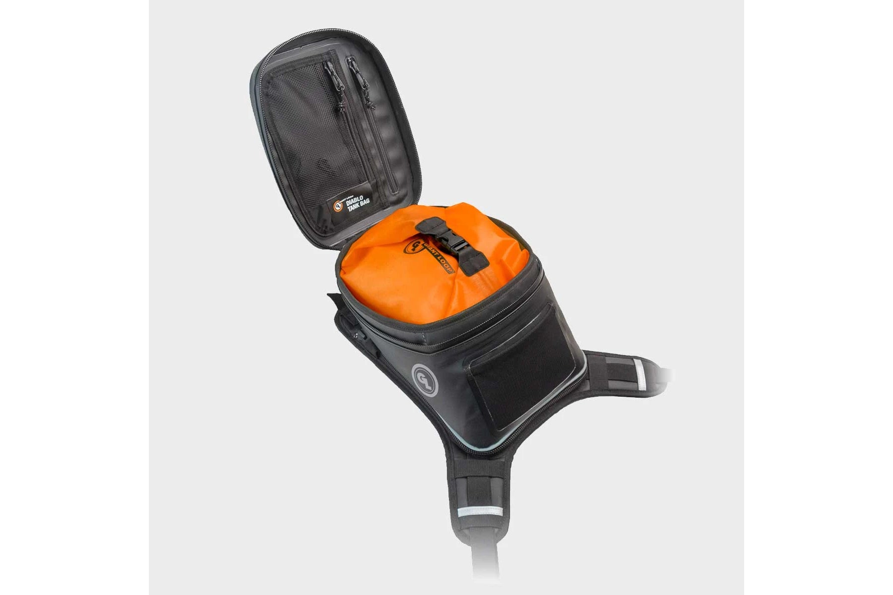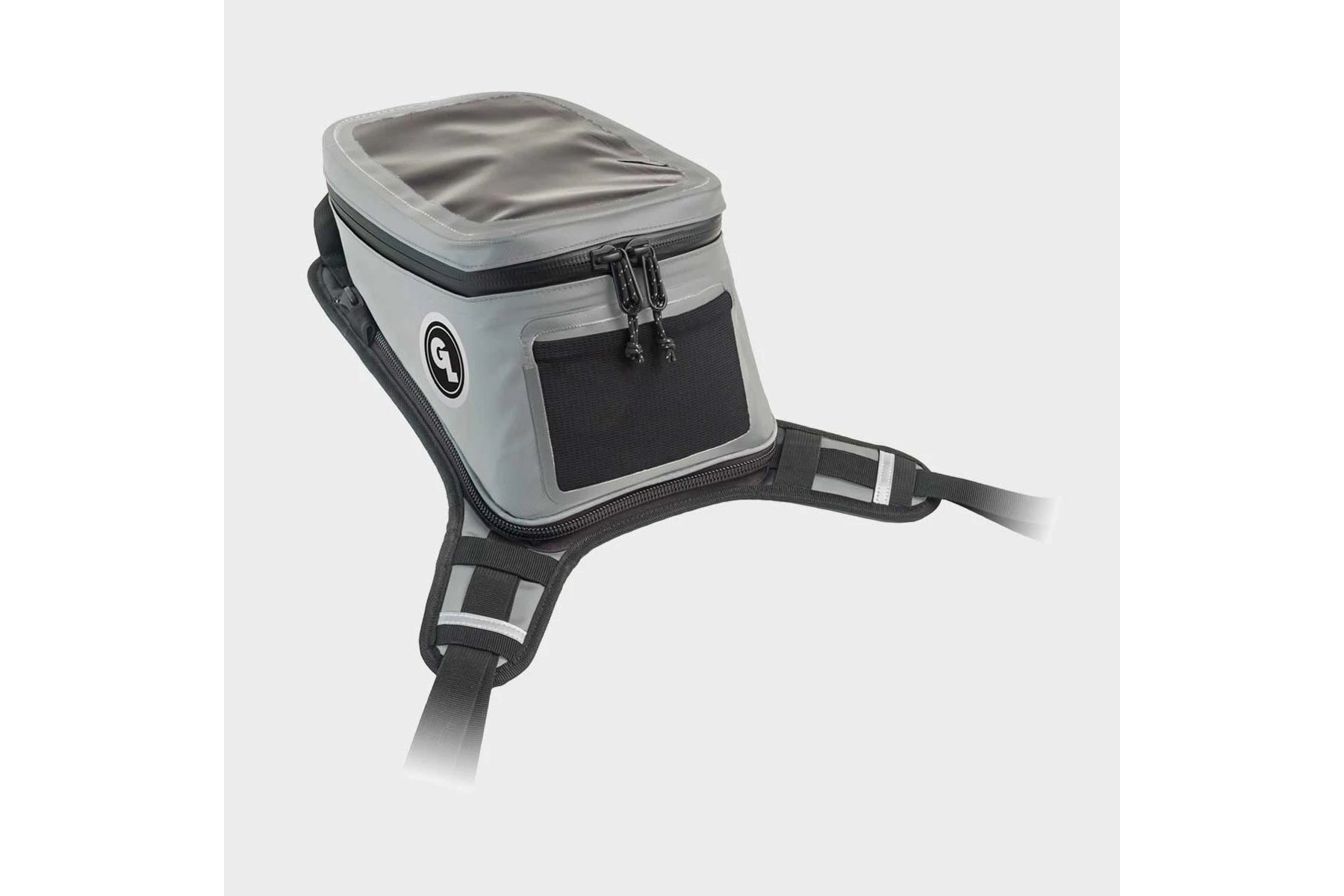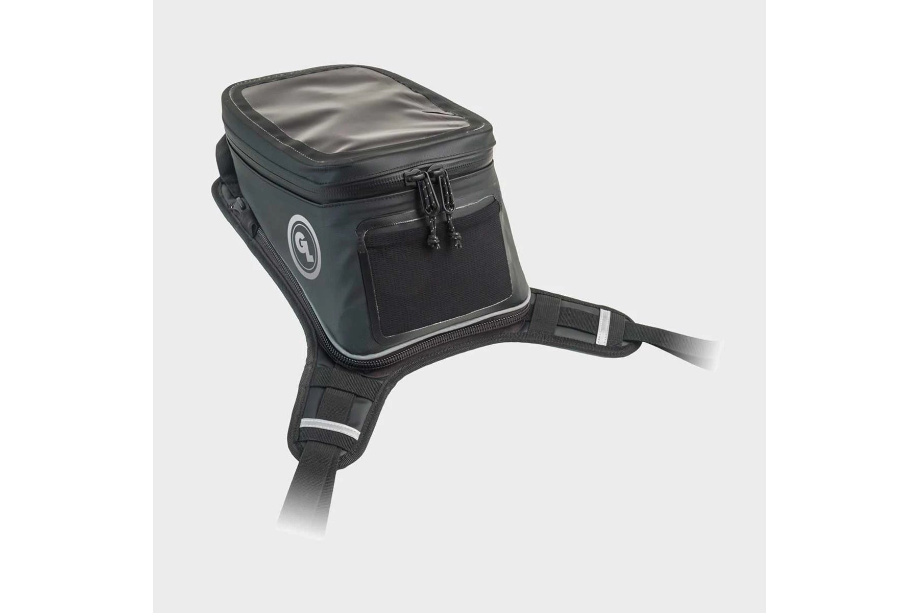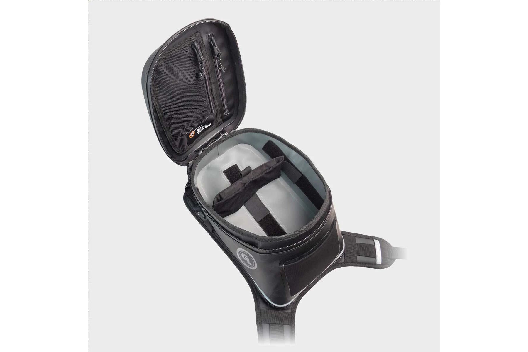 Fuel fills are a breeze with the Diablo: unzip the tank bag from the harness for quick and easy fuel access. Add to that, electronics pass-throughs integrated throughout each compartment, a full-length interior lining with hook-and-loop-accepting fabric compatible with many camera bag dividers, and included waterproof Giant Loop Tank Bag Dry Pod; the result is a bulletproof adventure-ready tank bag.