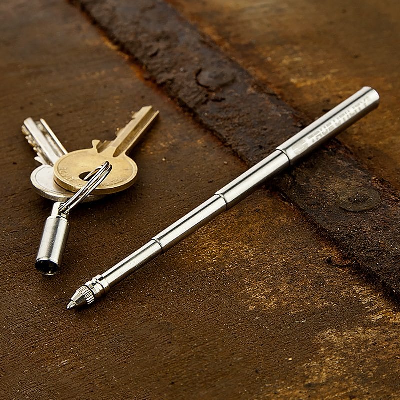 The Telepen is our smallest pen and is supplied ready to go. Designed to attach to a keyring or bag with the keyring , never get caught without a extendable pen again. This beautifully crafted tool will always be there when you need it.