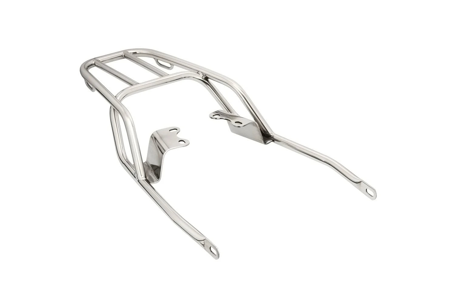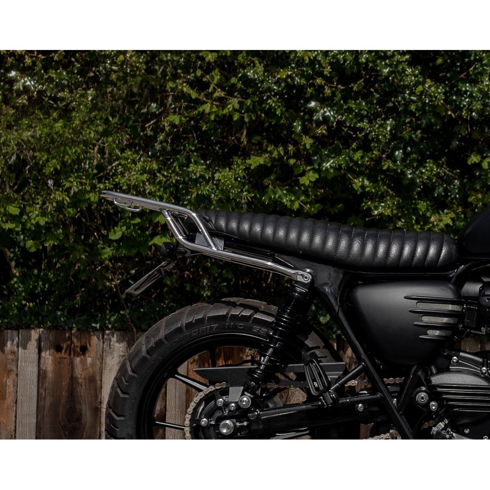 The Grand Tourer Rack is more capable for longer sojourns into the countryside than our Skirmish Mini Rack and as such as well as mounting under the frame it also uses the shock bolt mounts for extra brace to carry a bit more weight