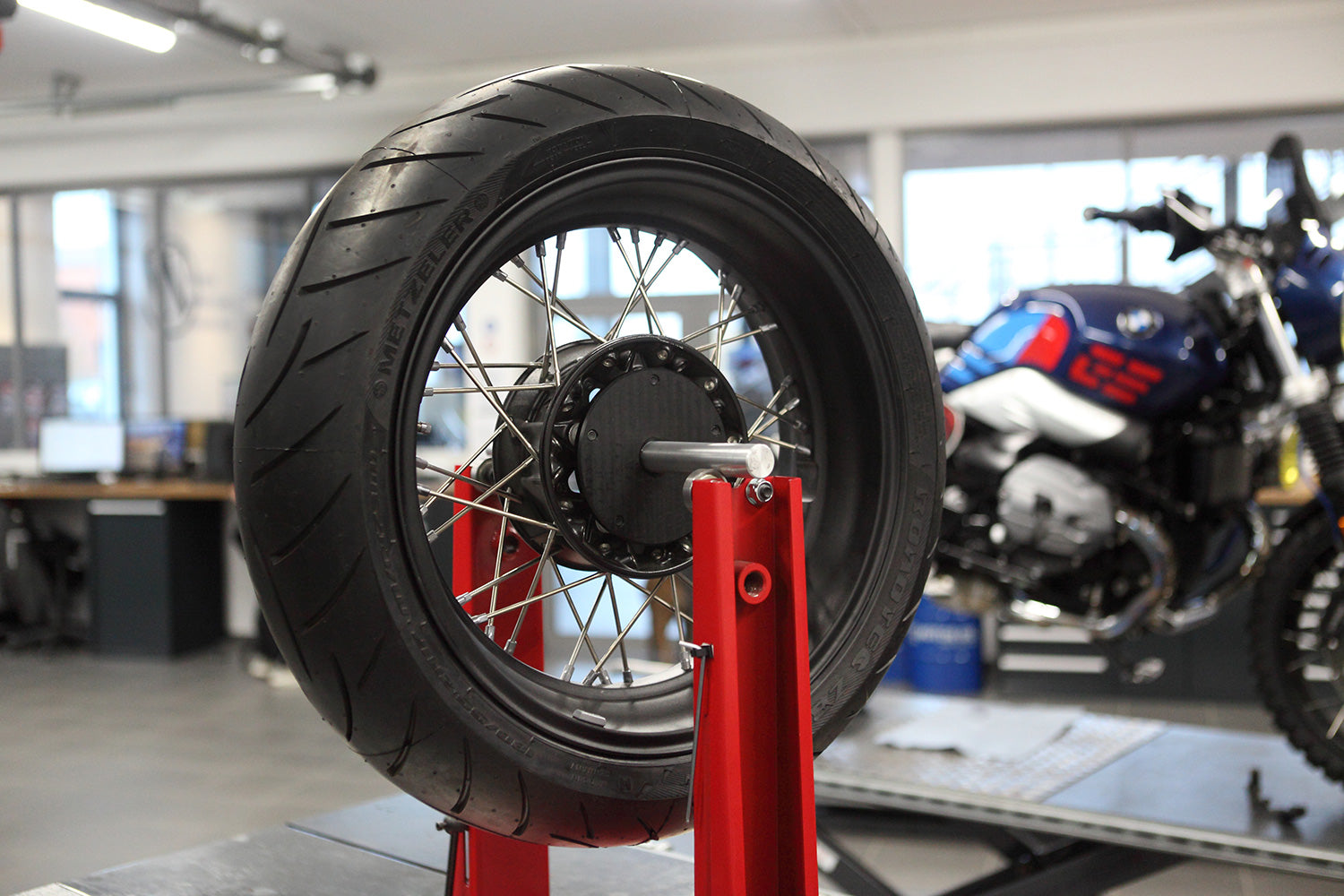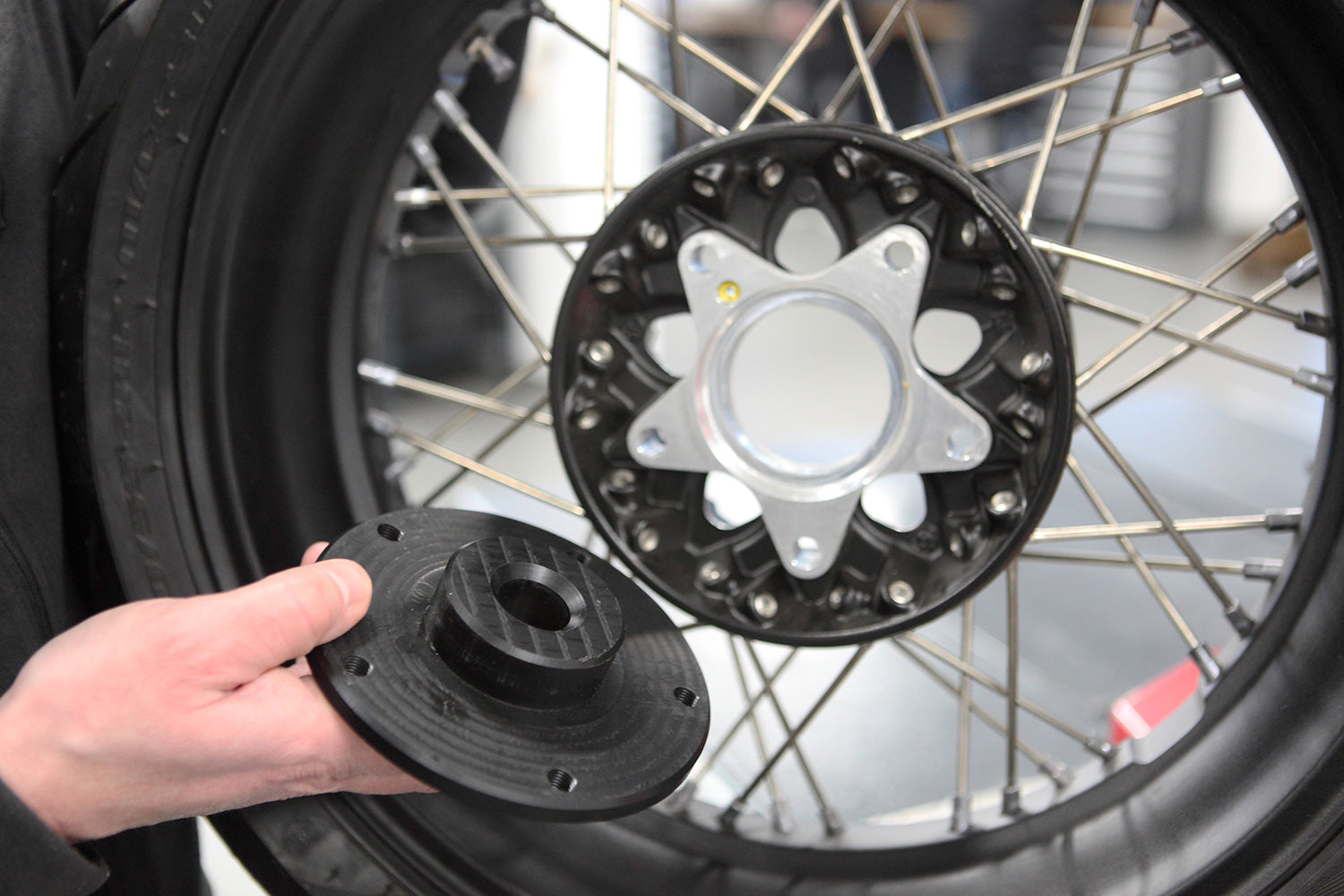 The hub of the rear wheel rim has a diameter for which there are no standard axle attachment points for balancing. Now there is! Our balance adapter sits snugly inside the wheel hub, centres it and screws onto the flange of the rim at five points. This means the 25 mm axles of all standard balancers or balancing stands can accommodate the rear wheel safely and without clearance. We include a matching axle (Ø 25 mm, length 420 mm) with our balance adapter.